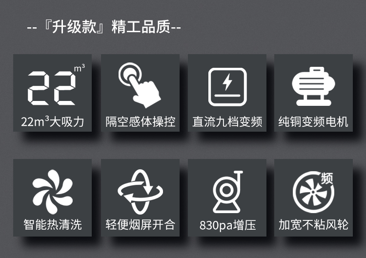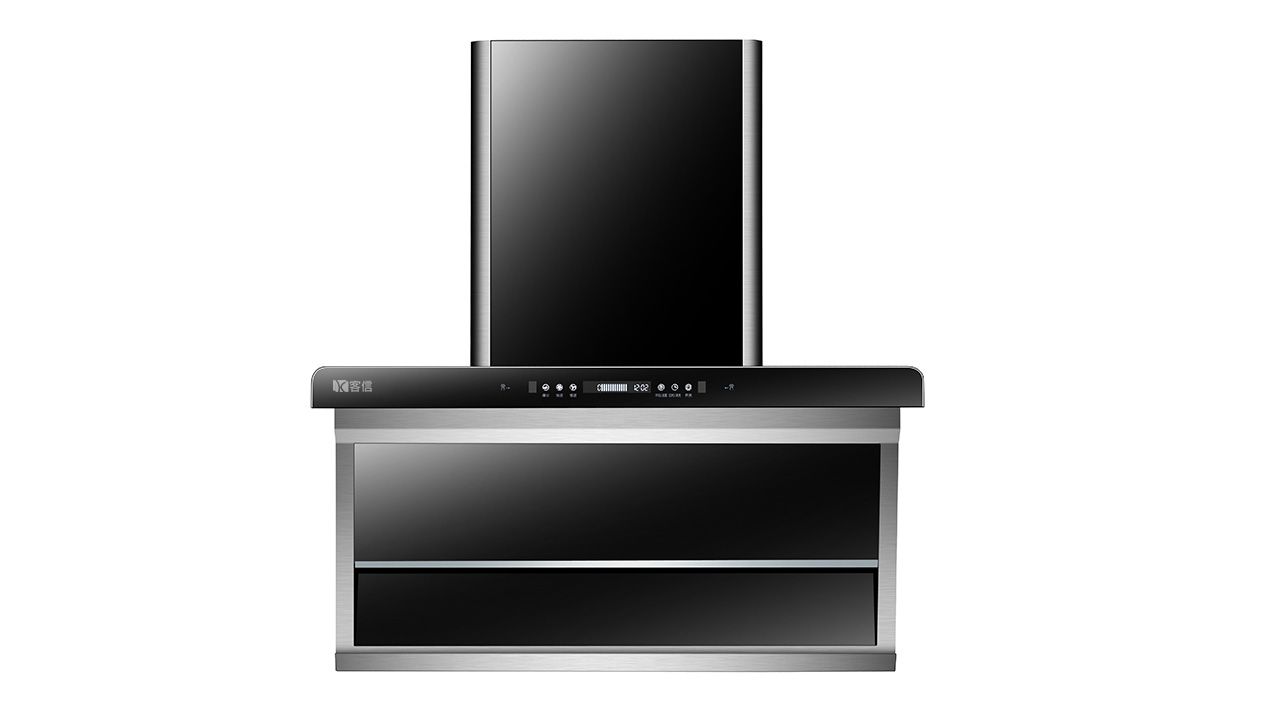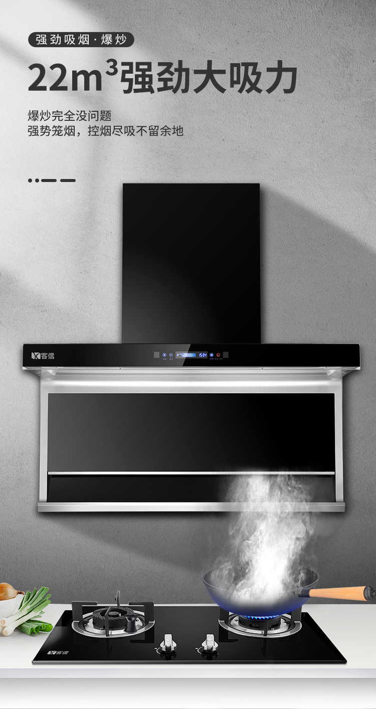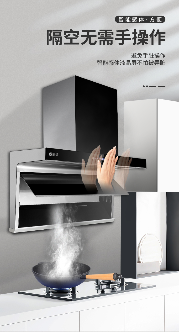 客信大吸力七字形侧吸式吸排式抽油烟机采用塑封36#全铜线电机不碰头不走烟,易清洁,吸排油烟更快速,触摸带体感控制开关。